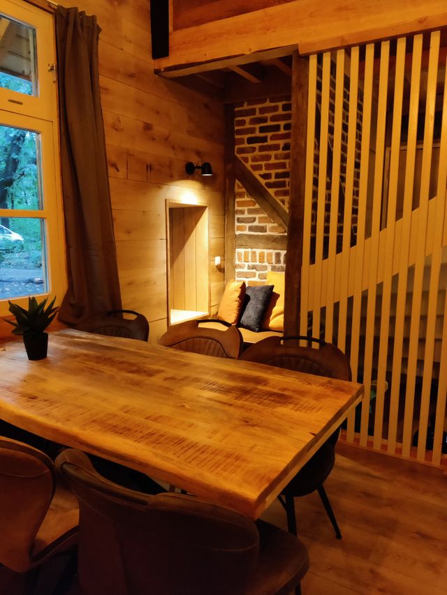Deze ruime vierpersoons cabin biedt comfort en sfeer. In de woonkamer met eikenhouten wanden en vakwerk kun je tafelen, een bordspel spelen, tv kijken of ontspannen met muziek via de Sonos-speaker. De houten spanten van douglashout uit eigen bossen en een antieke houten kano in de nok geven de kamer een uniek karakter.