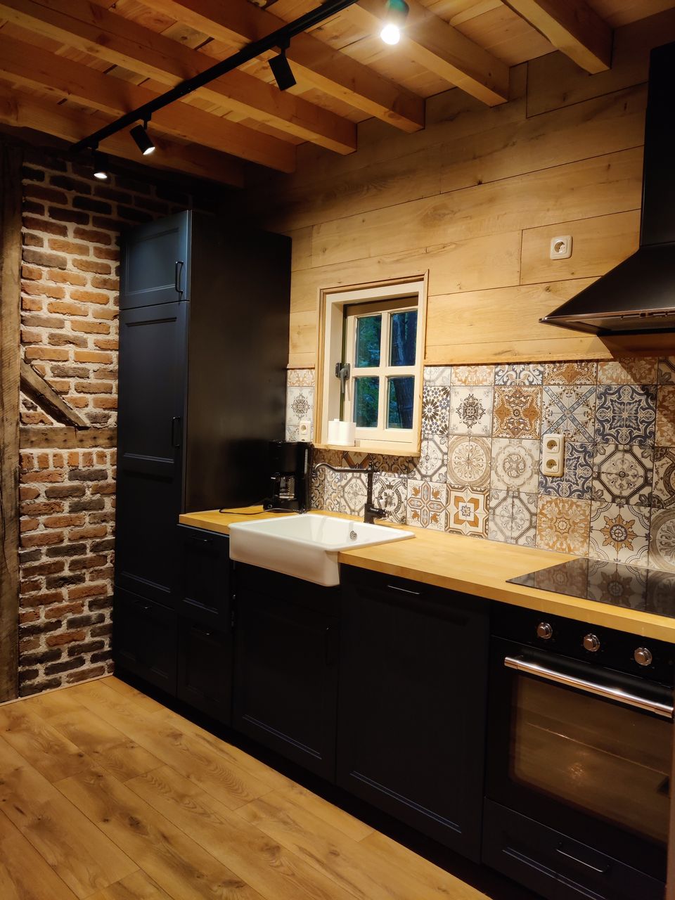 De open keuken is compleet uitgerust met oven, inductiekookplaat en koelkast, inclusief servies en bestek.