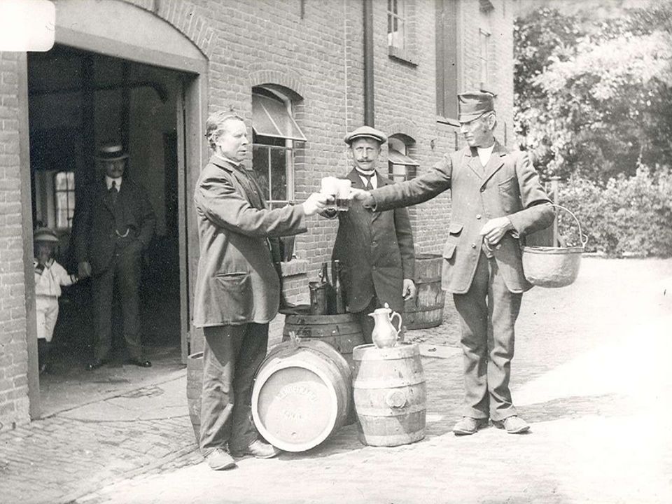 Bron: Nederlandse Biercultuur. Foto: proostende brouwersknechten bij brouwerij De Zon in Schaijk, omstreeks 1910. Bron: Heemkunde Schaijk-Reek.