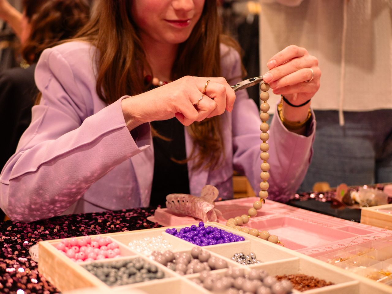 Wij schoven aan bij de workshop sieraden maken. Je hebt geen ervaring nodig en je hoeft niks mee te nemen: gewoon aanschuiven en lekker aan de slag gaan. Voor €39 per persoon krijg je alle materialen, een drankje en iets lekkers. Nikki helpt je op weg en tijdens de workshop maak je twee tot drie sieraden, zoals oorbellen, armbandjes, kettingen of telefoonkoorden.