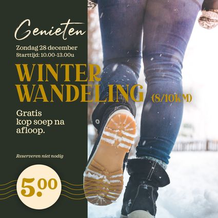 Loop op zondag 28 december mee tijdens de Winterwandeling (8/10 km). Start tussen 10.00 en 13.00 uur, afsluiten met een gratis kop warme soep. Deel...