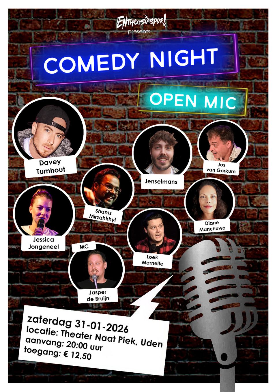 De avond biedt een mix van ervaren comedians en nieuw talent. Zes tot acht comedians krijgen elk 8 tot 12 minuten om hun beste materiaal te spelen voor een enthousiast publiek. De presentatie is in handen van Enthousiasper.