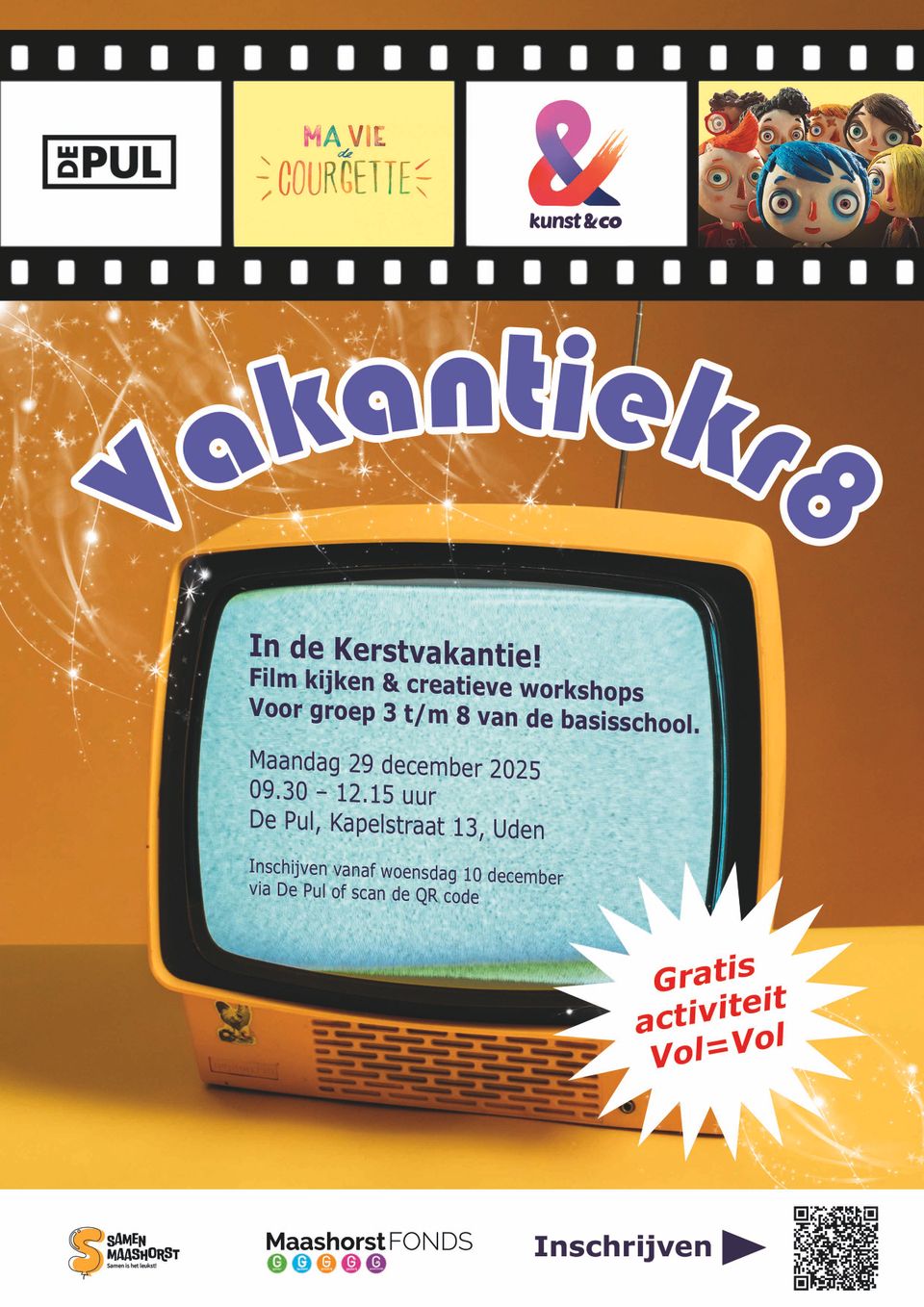 Zoek je in de schoolvakantie een leuke én gratis activiteit voor je kind? Samen met Kunst & Co organiseert De Pul Uden Vakantiekr8, speciaal voor kinderen van 6 t/m 12 jaar (groep 3 t/m 8). De dag begint met een filmvoorstelling, waarbij ouders samen met hun kind de zaal in mogen. Daarna volgen creatieve workshops, waarin kinderen kunnen kiezen tussen animatie-stopmotion of maak je eigen 3D superheld. Ondertussen kun je rustig wachten in de kleine zaal of in de foyer, waar ook ruimte is om elkaar te ontmoeten of even te werken. Het is ook mogelijk je kind af te zetten en later weer op te halen.