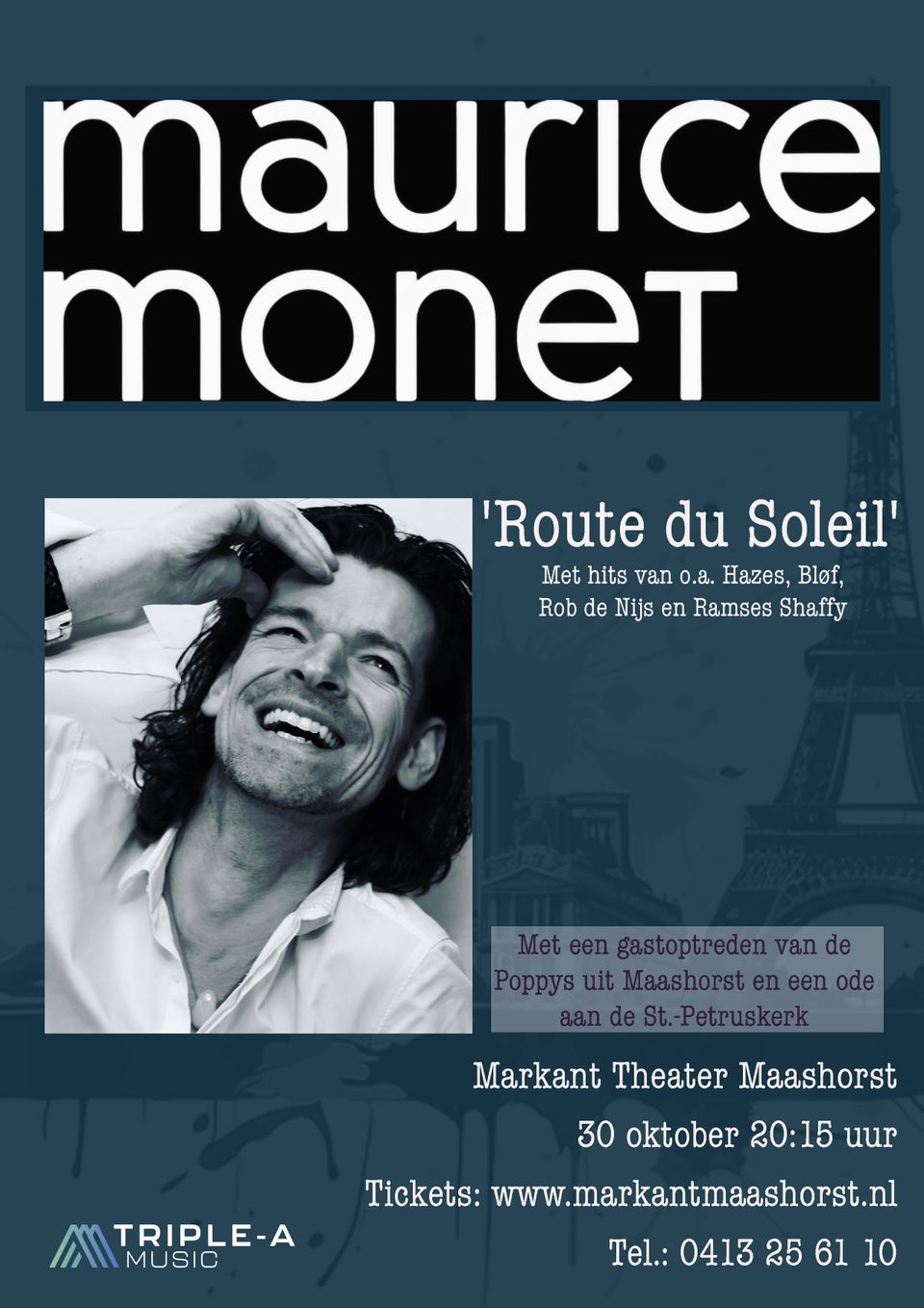 Samen met zijn fantastische liveband weet Maurice het publiek iedere keer te verrassen met zijn Route du Soleil langs al die Nederlandse klassiekers. Een route vol herinneringen — zoals de tankstations en de uitdaging van het kaartlezen — maar ook momenten zoals de ondergaande Franse zon en de overweldigende Tour de France! Beleef in Markant Theater Maashorst een avond vol herkenbare nummers uit Nederland, maar dan in een fantastische Franse jas. Een Frans feest van herkenning!